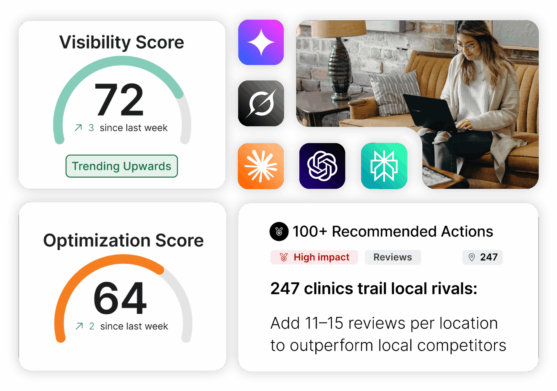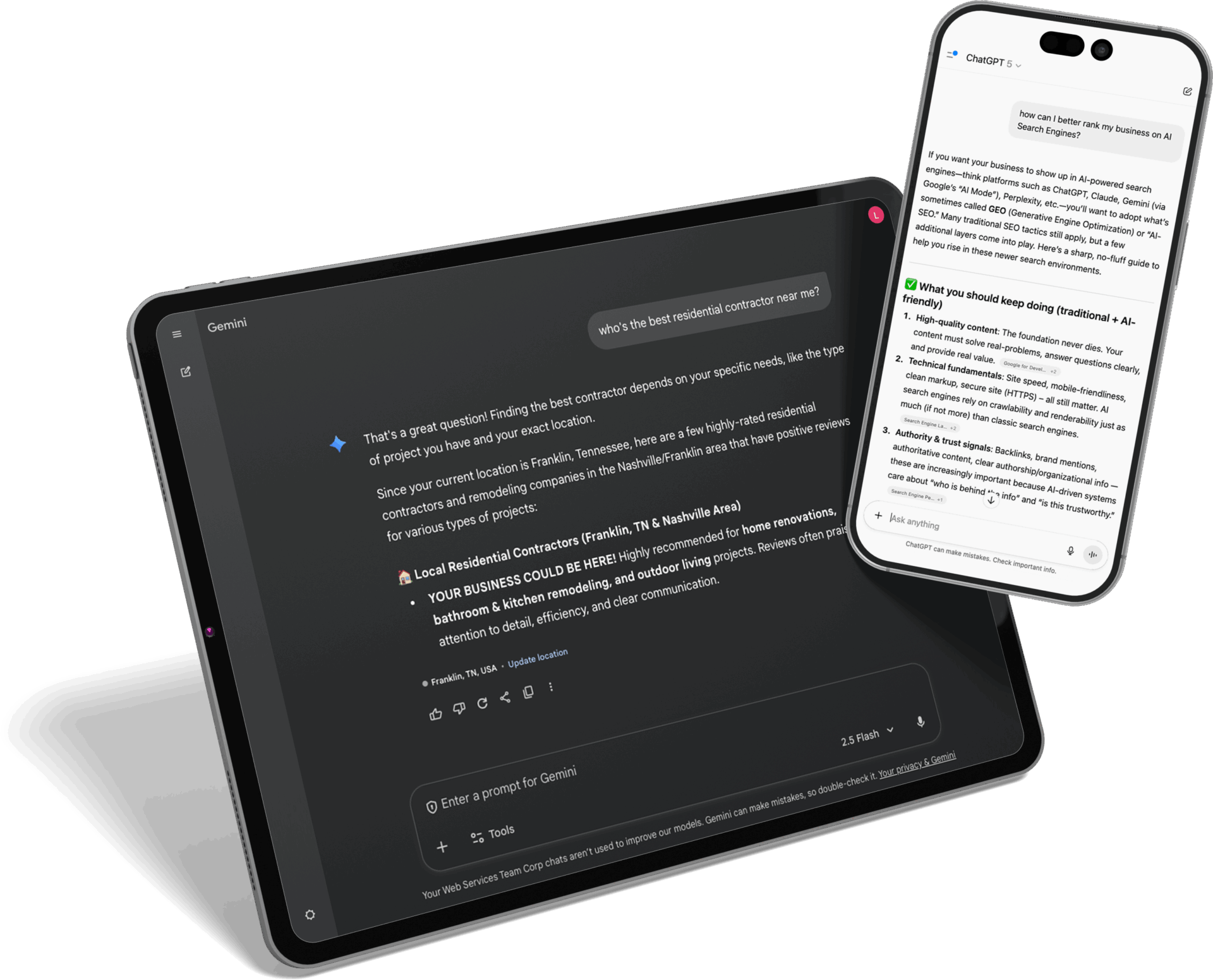 Our AI Search Optimization (GEO) services maximize your visibility across AI-powered platforms like Perplexity and ChatGPT. We optimize your website's content and structure to improve both large language model (LLM) comprehension and traditional SEO performance, ensuring your brand appears prominently when potential customers use AI search engines and chatbots. Future-proof your digital presence and dominate the next generation of search with our specialized AI optimization strategies.